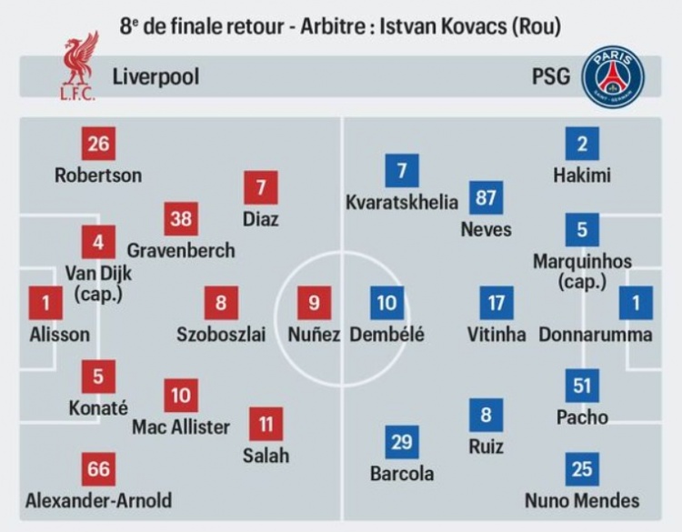 2025-03-11 23:34:41法媒预测利物浦vs巴黎首发:萨拉赫对决登贝莱,努涅斯出战