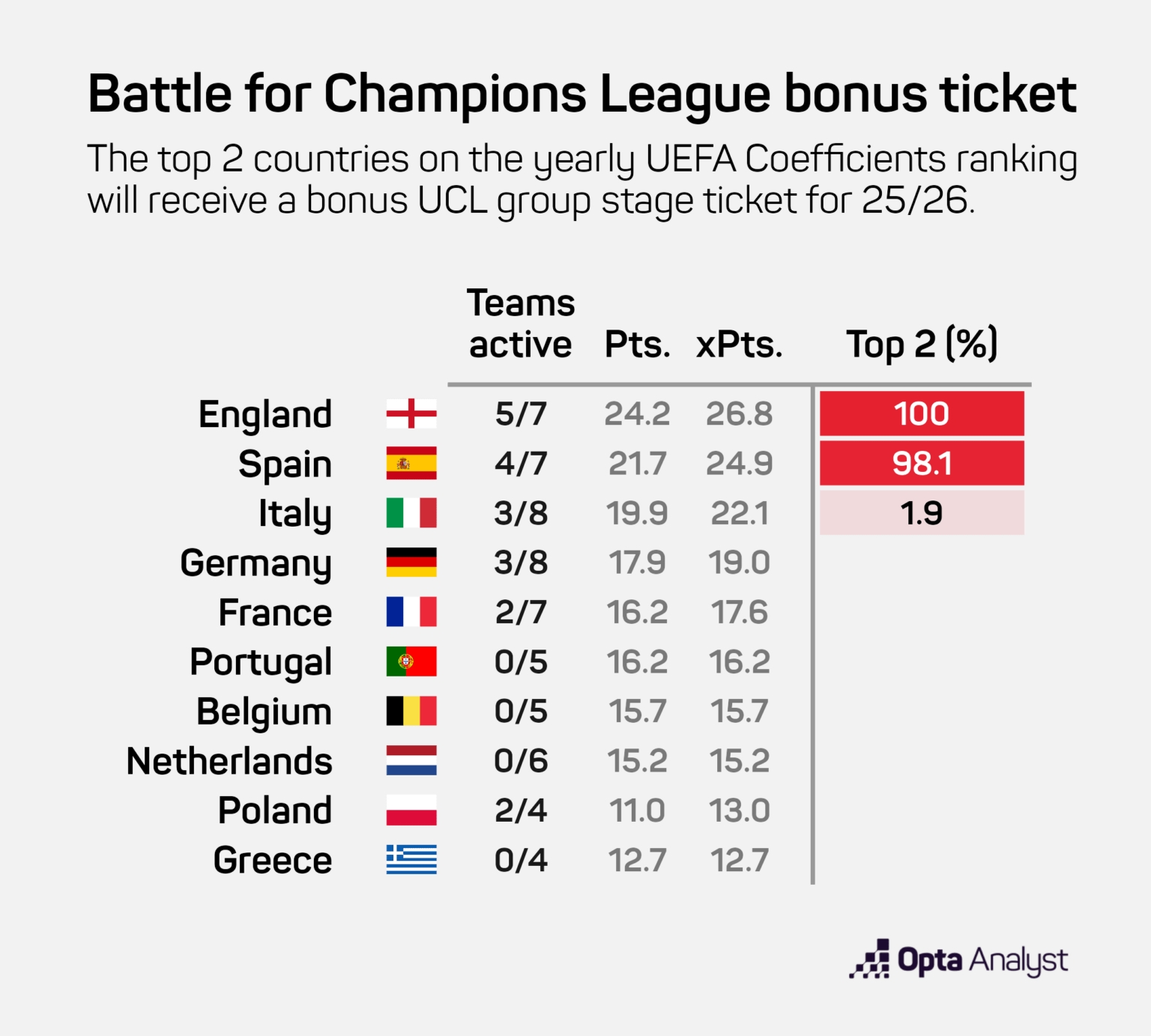目前英格兰手握24.25的积分,领先第二名西班牙2.5分。考虑到欧足联系数分系统的运作方式,在接下来的欧战1/4决赛阶段,只要有一支英格兰球队赢得一场比赛,就可以为英超锁定一个额外的欧冠联赛席位。