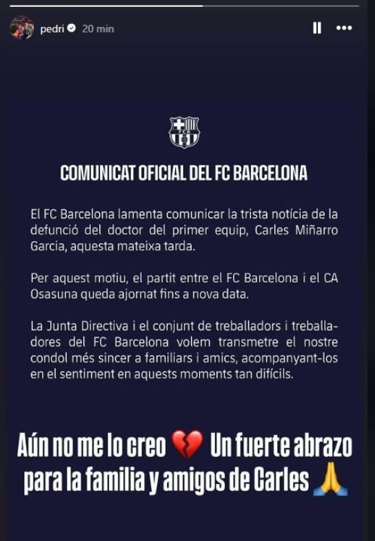 在消息出来后,许多巴萨球员都在社交媒体上悼念了卡莱斯,佩德里转发了讣告并写道:“我仍然不敢相信这是真的,给卡莱斯的家人一个大大的拥抱。”